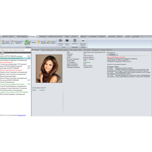 Для обеспечения максимальной скорости и качества обслуживания пациентов предусмотрен быстрый поиск пациента (по имении, фамилии, отчеству, номеру телефона, номеру карты и любым другим данным из личной карточки клиента); программа сама просчитает скидку, если у пациента есть дисконтная карта, или если он попадает под какую либо заранее созданную акцию;