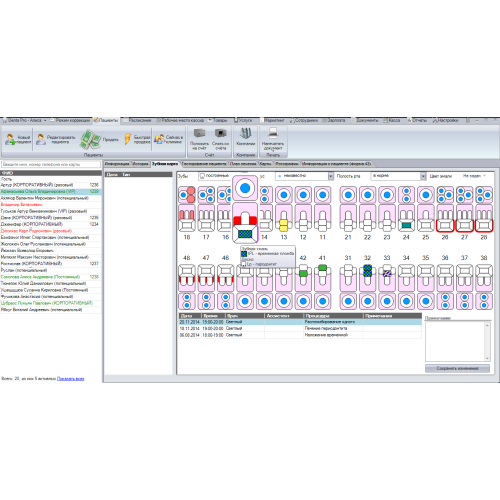 Раздел "Зубные карты" программы Denta Pro позволит вашим врачам и администрации вести историю по каждому отдельно взятому зубу, ставить отметки, какие процедуры проводились на зубе, просматривать, кто из врачей работал с пациентом и делал те или иные манипуляции. Это позволит сократить время на поиск информации для докторов.